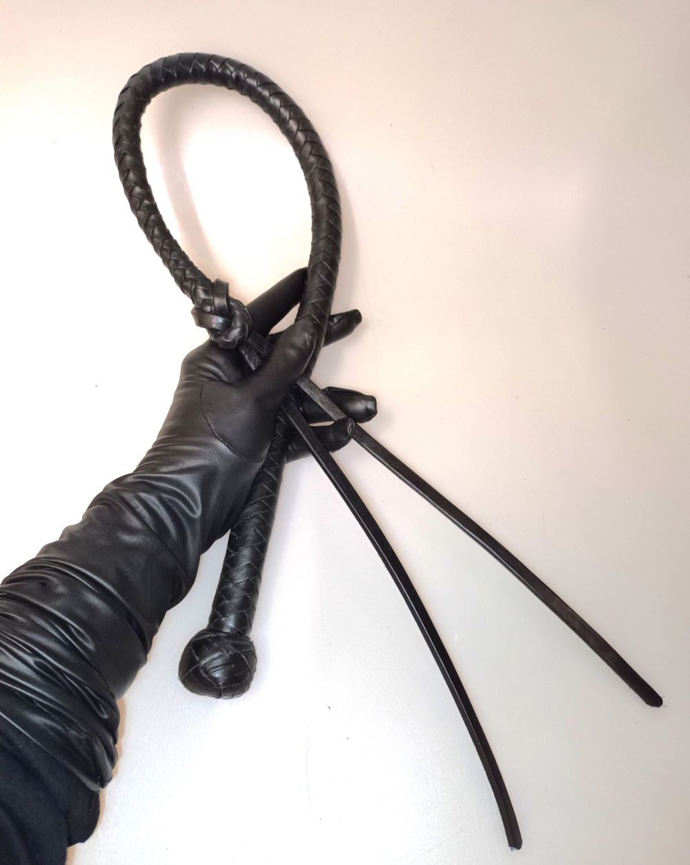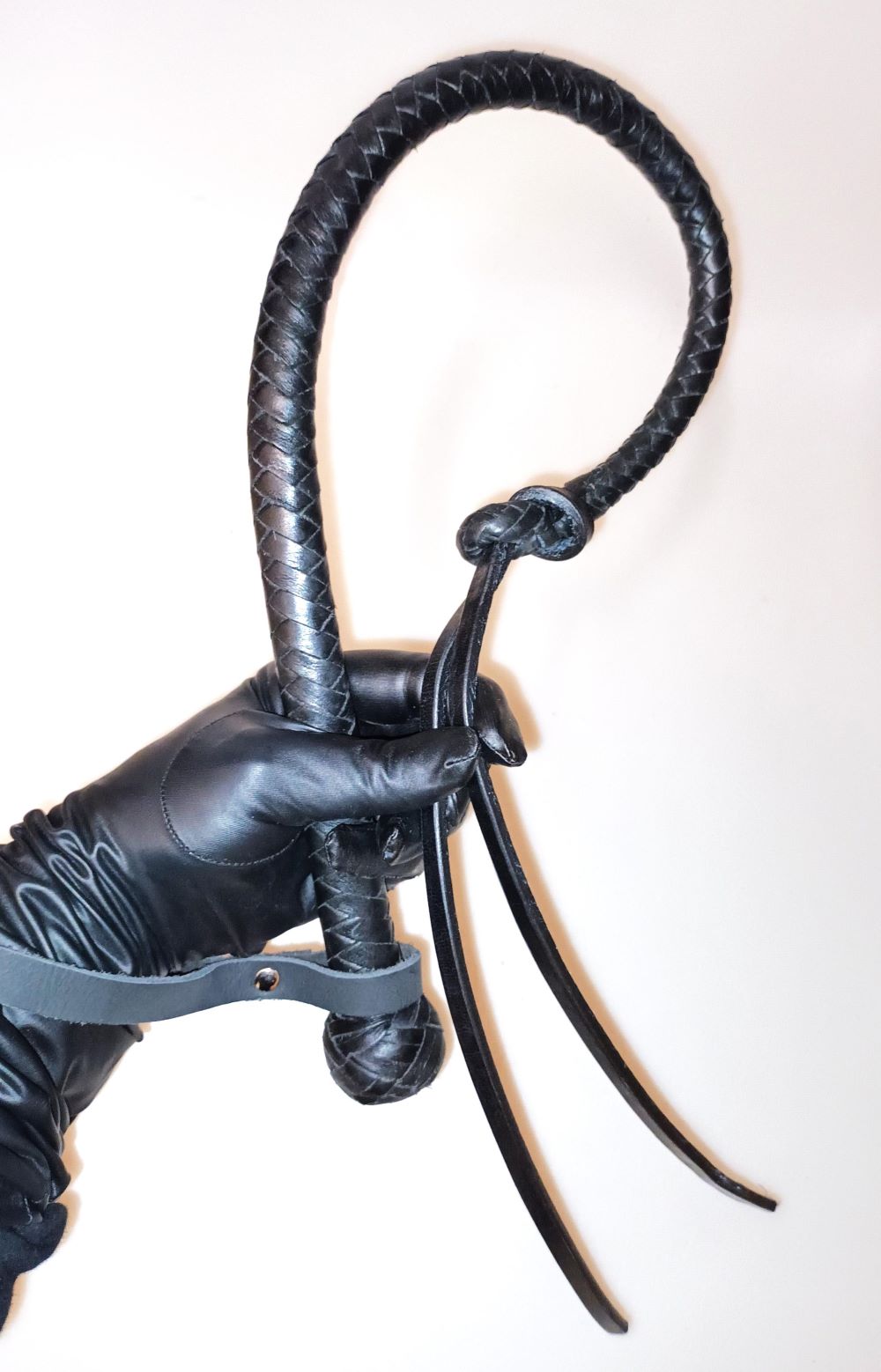 In der Farbe schwarz mit zwei dicken, ca. 33cm langen Leder-Enden,