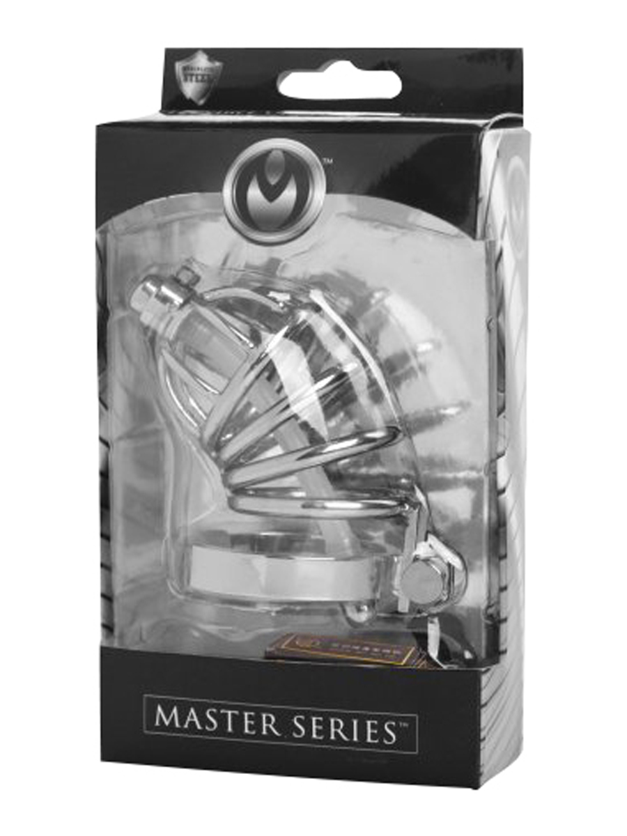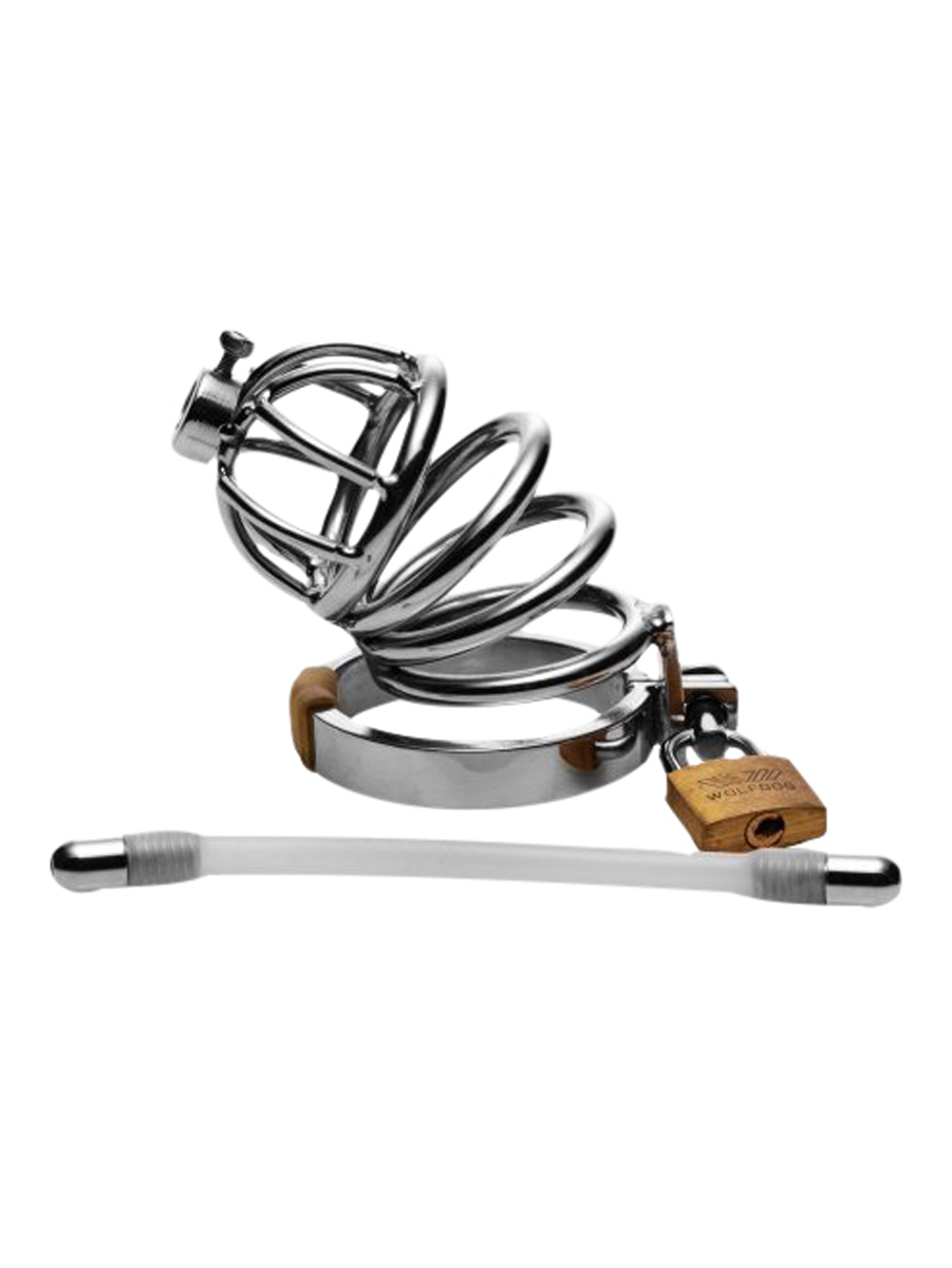 Gefertigt aus Edelstahl und mit einer abnehmbaren Harnröhrentülle aus Silikon, die Flüssigkeit durchlässt, wird der Peniskäfig sowohl innen als auch außen das Kommando übernehmen. Der flexible Penisstecker ist mit einem weichen Silikonkörper aus glattem und abgerundeten Metall an beiden Enden ausgestattet. Diese natürliche Form des Penissteckers ist ideal für ein längeres Spiel. Es gibt auch ein Durchgangsloch zum Wasserlassen oder zur Ejakulation. Der Basisring, der hinter Glied und Hoden passt, hat eine Gummimanschette, welche mit einem Scharnier verschlossen wird. Dadurch wird ein Kneifen und Unbehagen vermieden. Der Harnröhrenstecker ist mit einer Sperre - bestehend aus einer Sechskantmutter - versehen, welche das Herausrutschen des Steckers verhindert. Das Metallende verhindert auch ein Verrutschen weiter in die Harnröhre hinein.