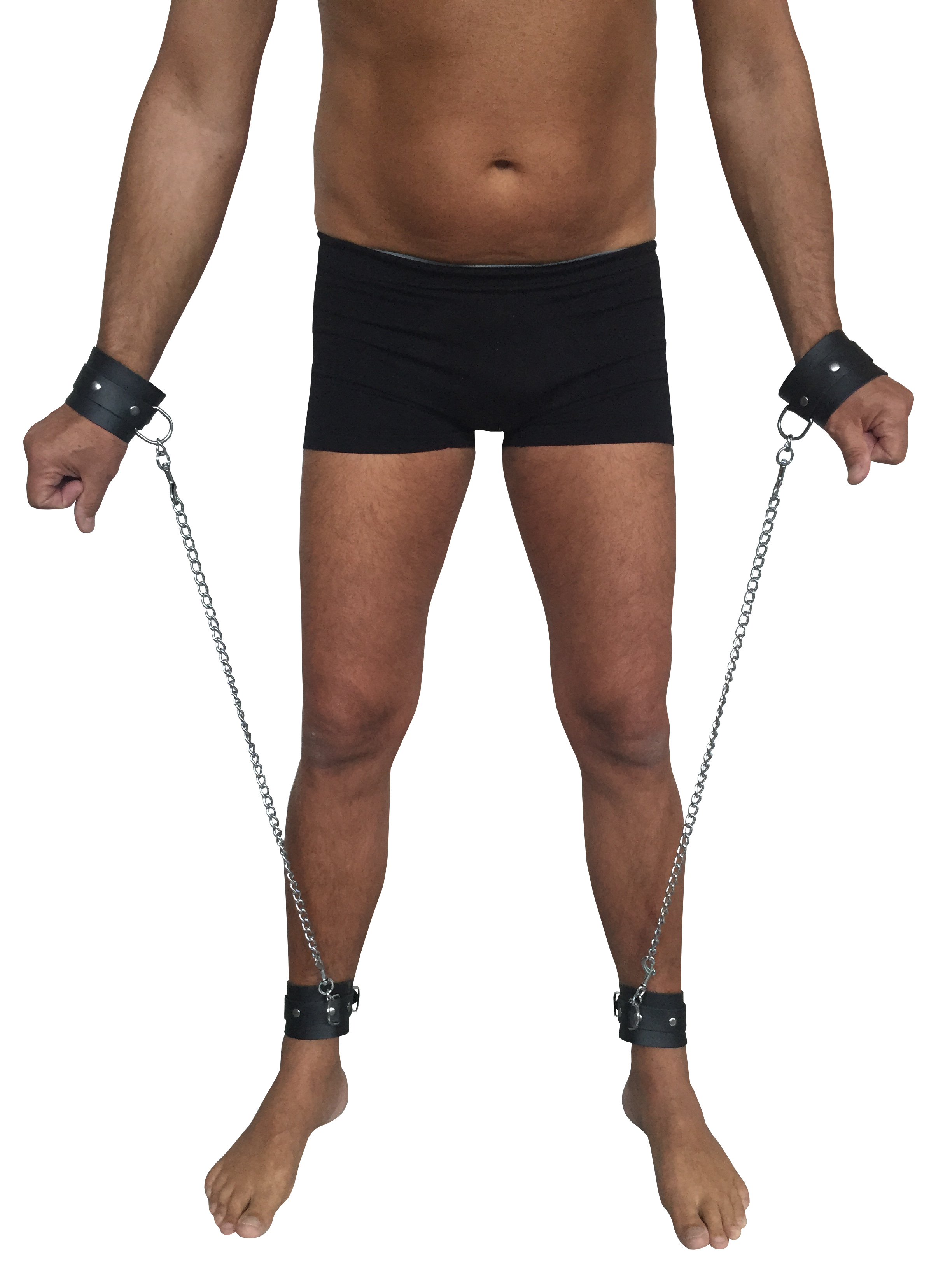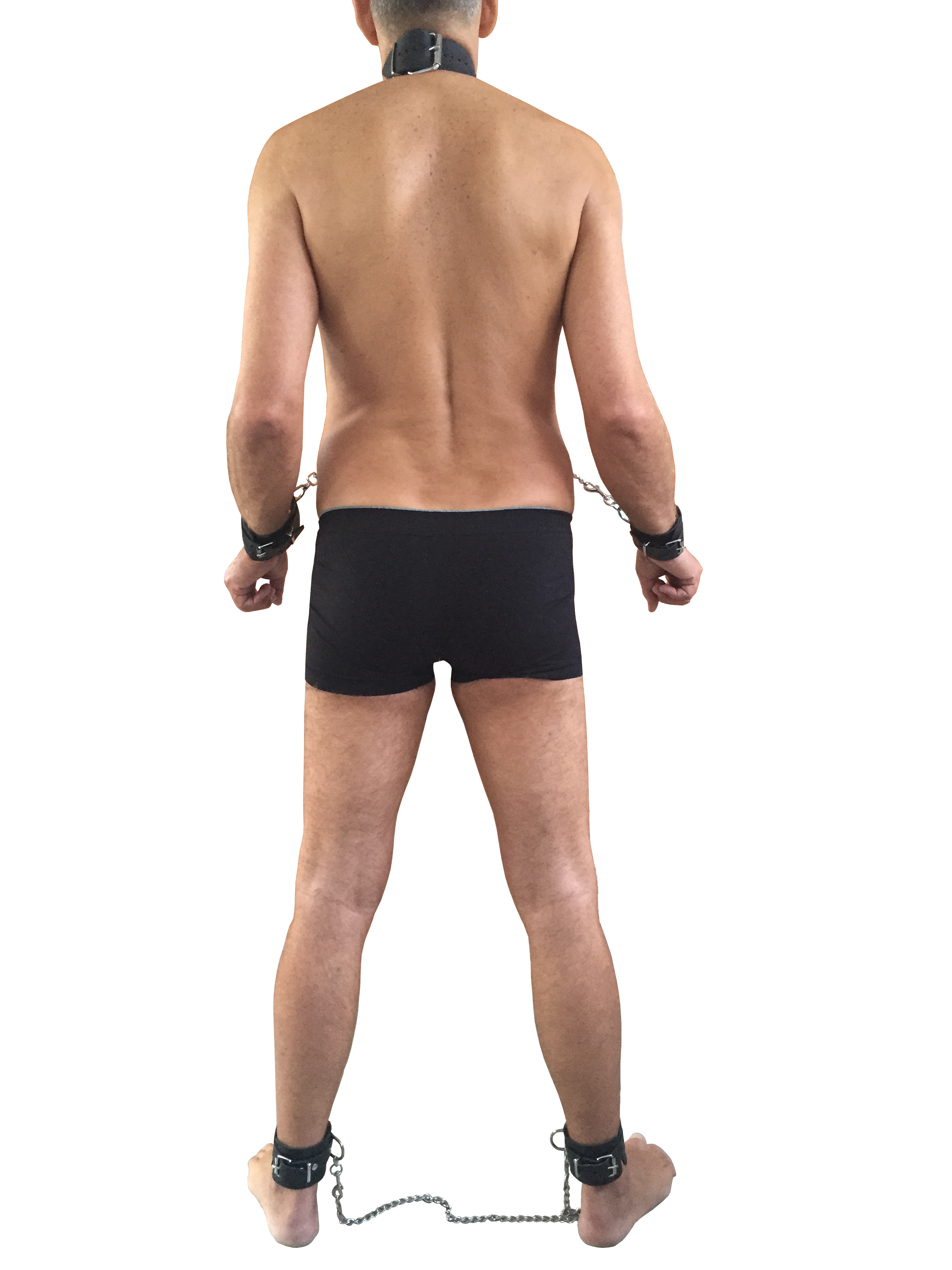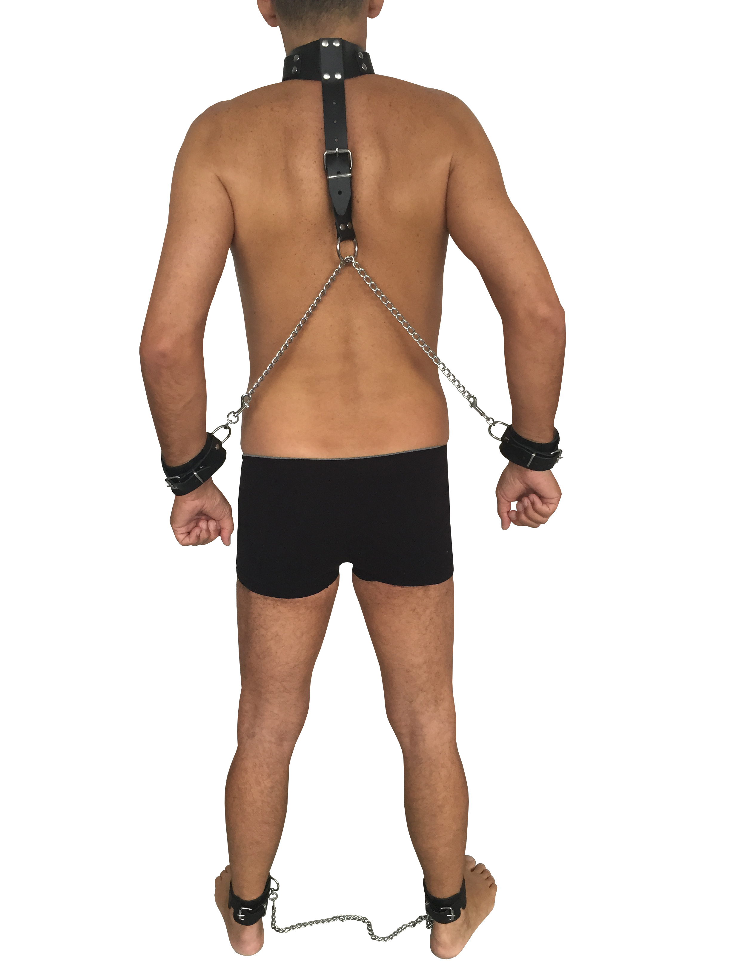 Hals, Hand, Fußfessel aus Leder mit Verbindungskette, individuell einstellbar.