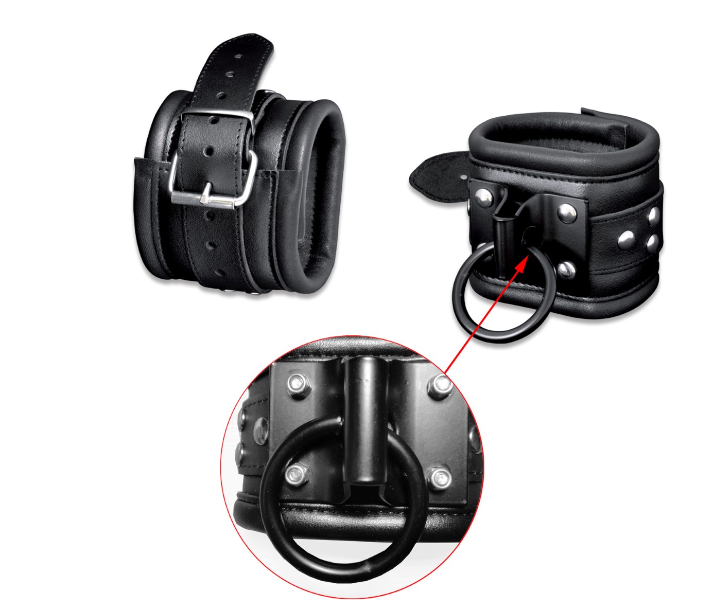 Leder Fesselset Rot/Schwarz mit drehbaren Edelstahlringen