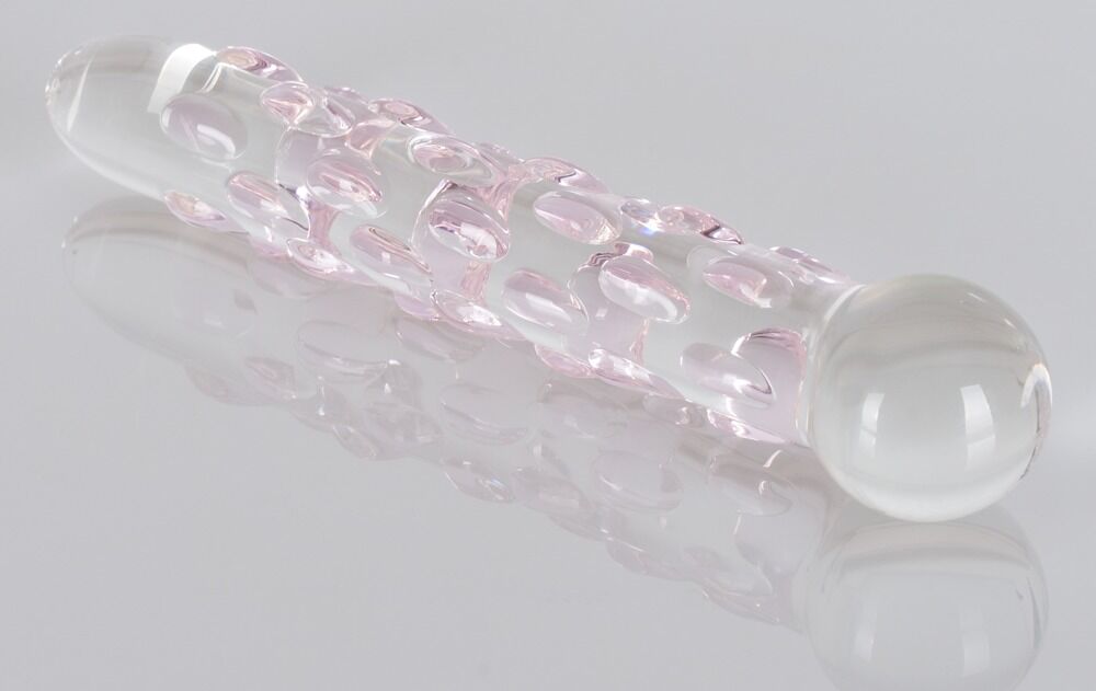 Transparenter Glas-Dildo mit pinkfarbenen Reiznoppen und Standfuß