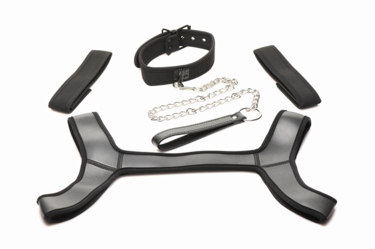 Das Set besteht aus einer Kapuze, einem Halsband und einer Leine, Manschetten und einem Geschirr.