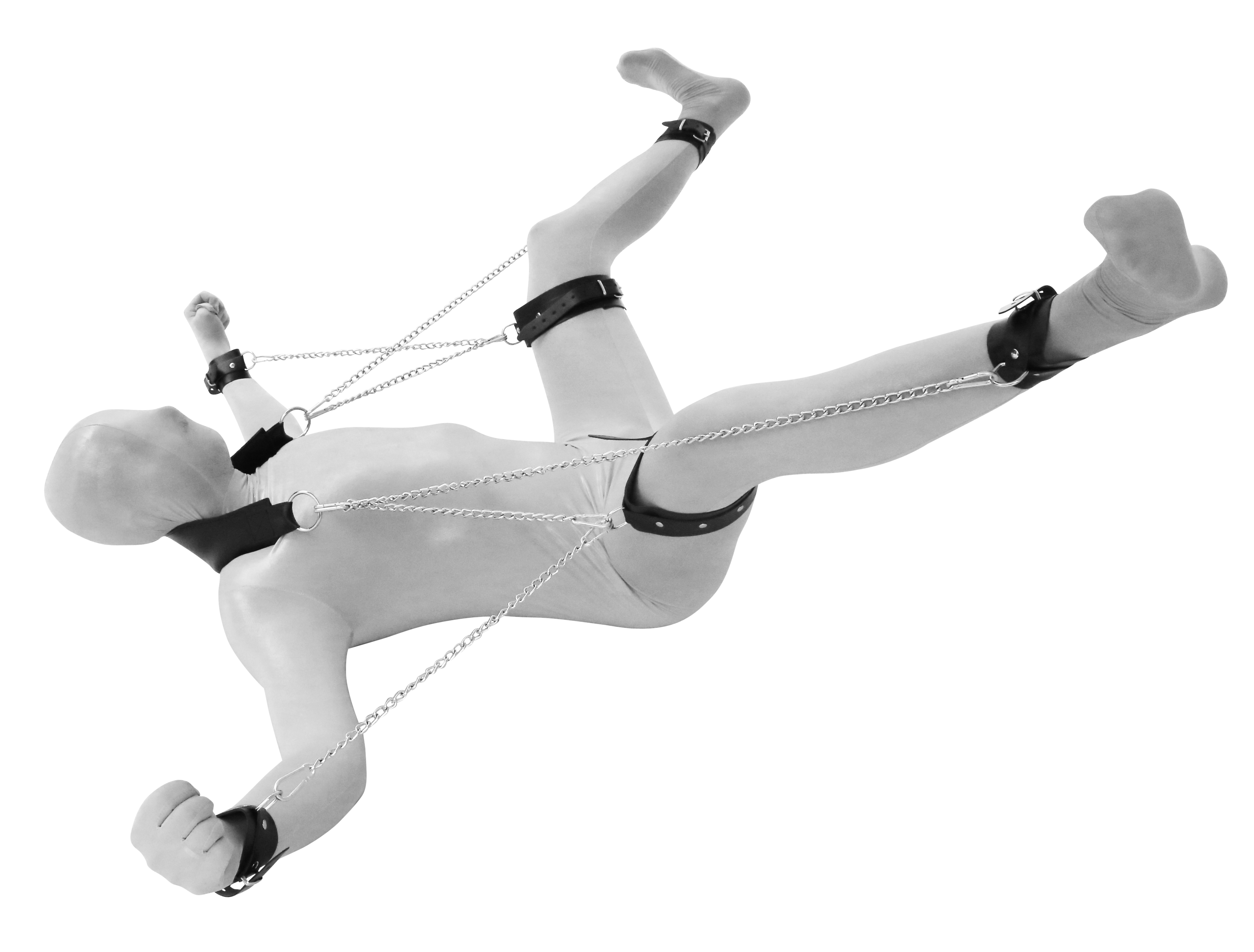 Hand-, Fuß-, Oberschenkelfesseln und Nackenstütze aus schwarzem Leder