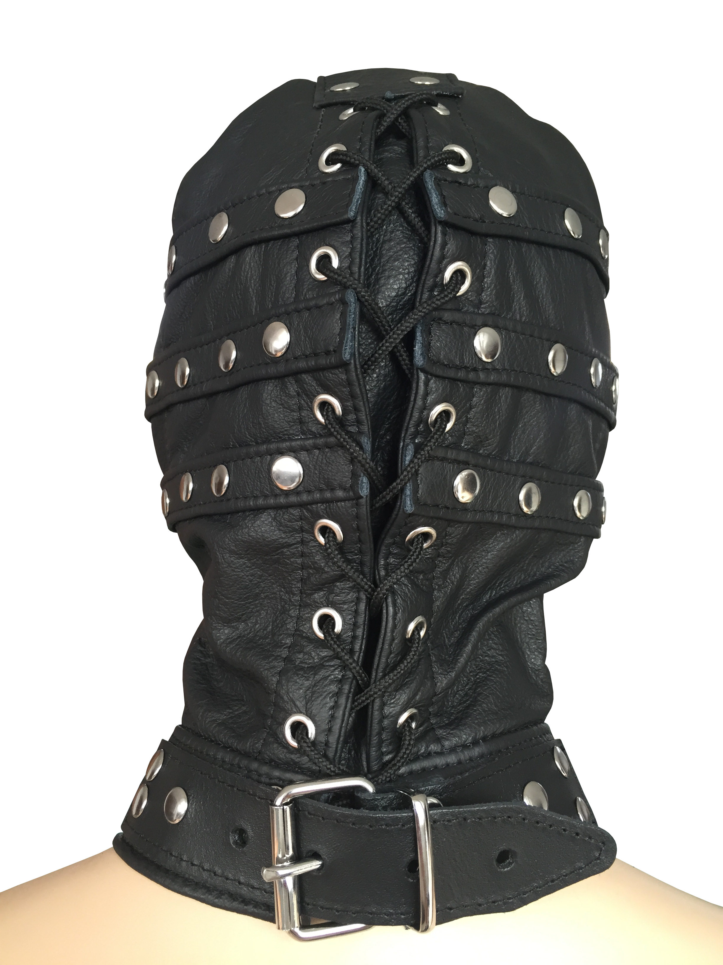 Die Maske hat zusätzlich eine abnehmbare und abschließbare Lederaugenbinde.