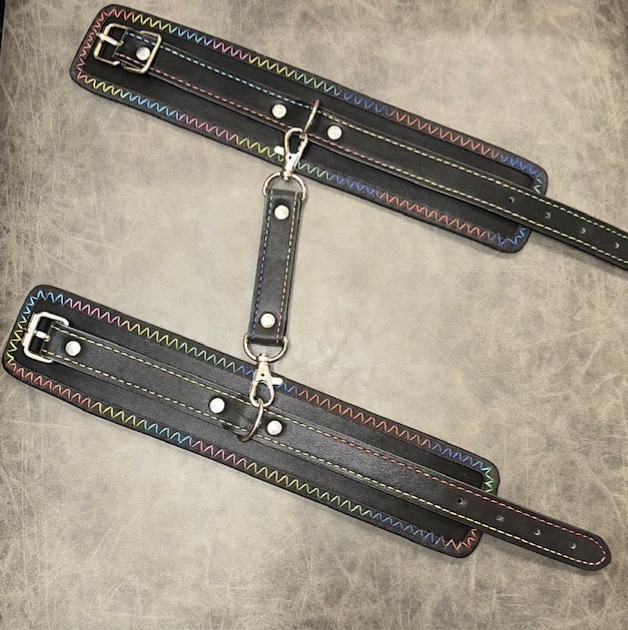 Mit regenbogenfarbener Naht und einem kleinen Hogtie dazu, mit vier Karabinern.
