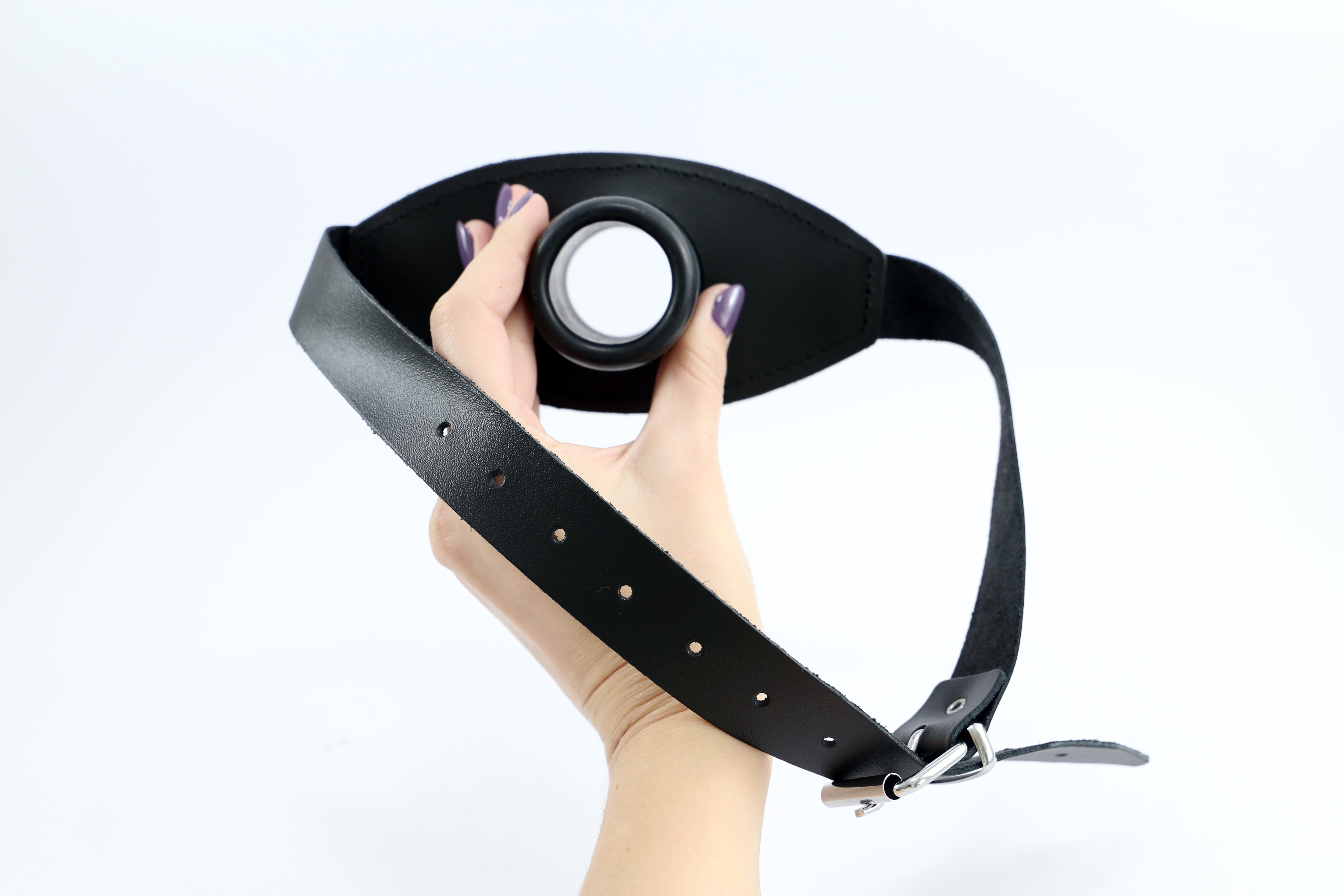 Mundeknebel aus Leder und integriertem Latex Rohr.