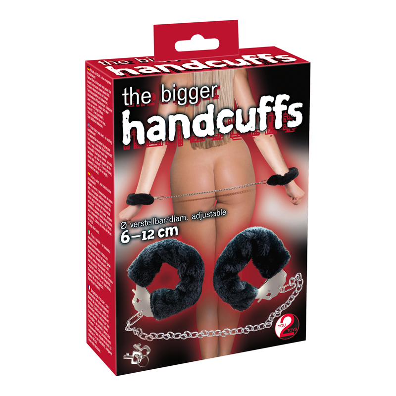 Schwere Handschellen mit langer Verbindungskette und schwarzen, abnehmbaren Plüschbezügen.