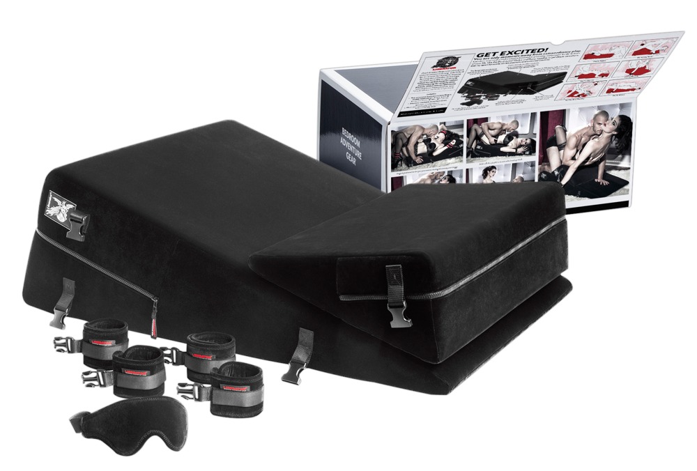 Zwei schwarze anatomisch geformte Liebeskissen (Wedge und Ramp) mit 4 Fesseln (2 x für Arme/Handgelenke und 2 x für Füße/Knöchel) und beiliegender Augenmaske.
